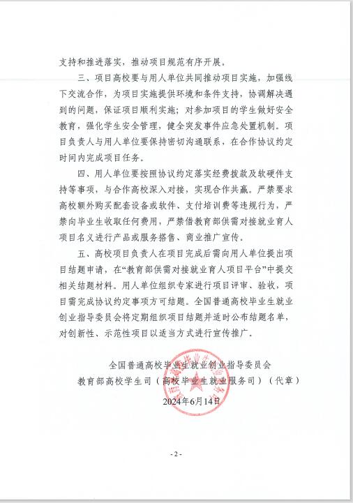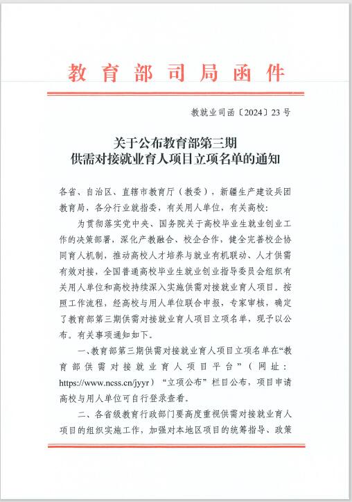 近日,教育部印发《关于公布教育部第三期供需对接就业育人项目立项名单的通知》(教就业司函〔2024〕23号),文件公布了教育部第三期供需对接就业育人项目立项名单,Beat365正版唯一官网必一共有3个项目获批立项。