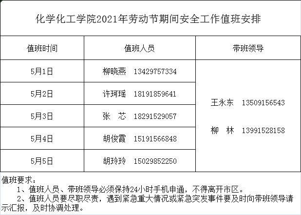 2021年劳动节期间安全工作值班安排