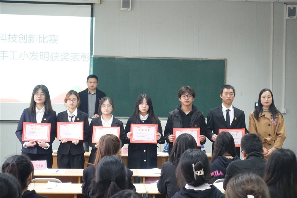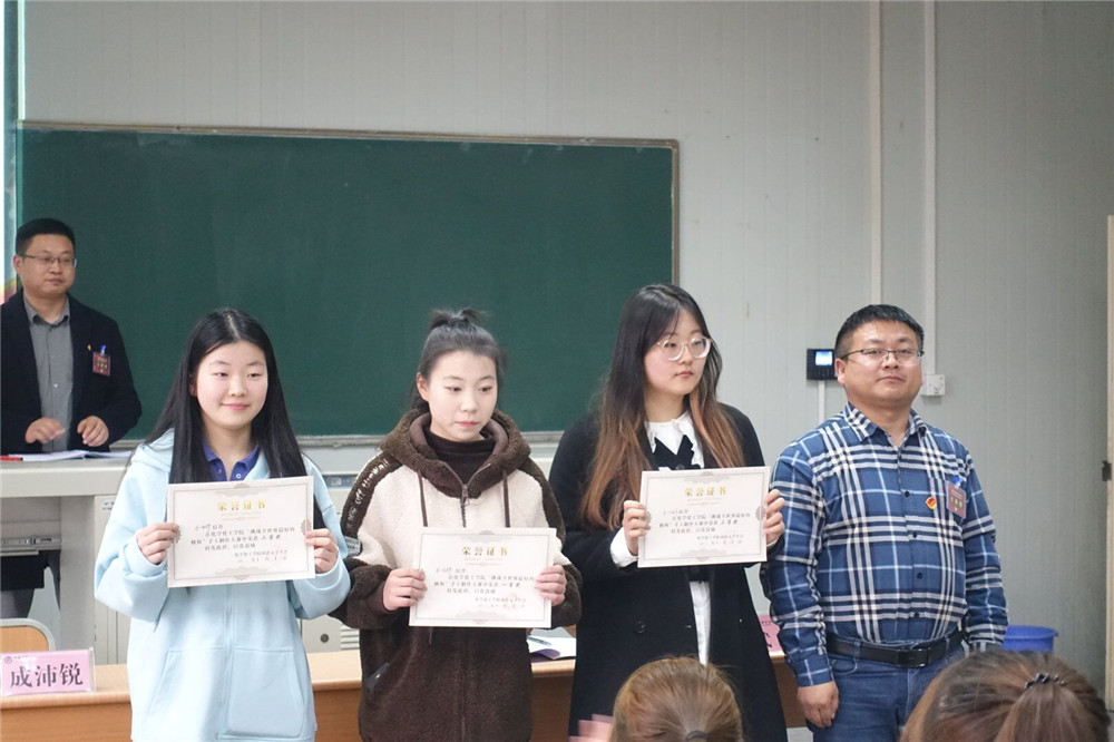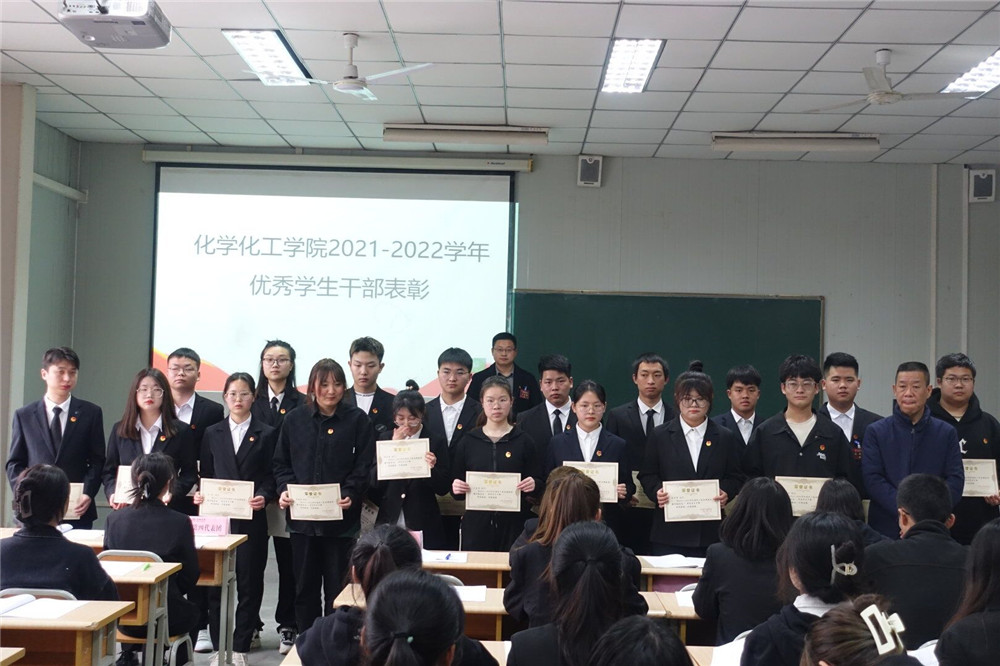 会议第四项,化学化工学院优秀学生表彰仪式。团总支书记成沛锐宣读《化学化工学院2021-2022学年优秀学生干部》、《2022-2023迎新优秀志愿者》和化学化工学院第二课堂活动的获表彰同学名单。由党总支书记王永东、青年教师兼职团总支副书记武立州、学工办主任王瑜对以上学生进行颁奖。