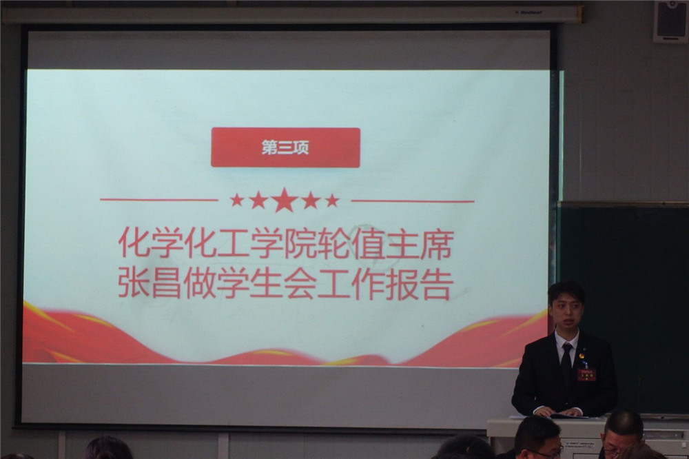 会议第三项,化学化工学院轮值主席张昌做题为《高扬理想主义深化组织建设在新时代新征程中贡献青春力量》的工作报告。对学生会往期工作进行总结,并对后期发展做出目标规划。学生会将持续加强制度建设,并围绕第二课堂持续提升活动质量,推动精品活动的建设。