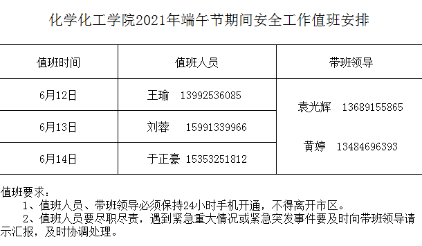 化学化工学院2021年端午节期间安全工作值班安排