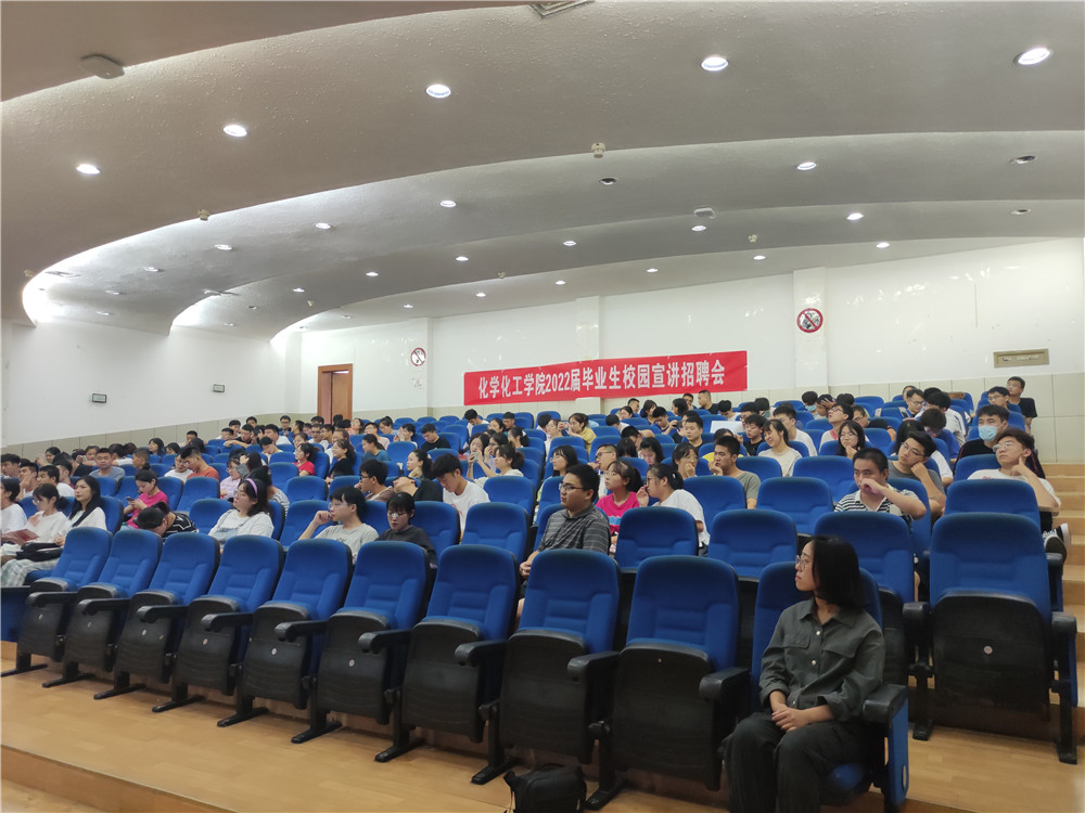 为深入落实党史学习教育“我为群众办实事”活动,全力推进2022届毕业生高质量就业,化学化工学院深入推进“实习实训+就业”工作落实落地。化学化工学院采取“走出去,请进来”的方式邀请企业来校开展校园专场招聘,2021年9月27日上午,化学化工学院邀请上海合全药业股份有限公司举行专场招聘会,会议在一号楼六楼报告厅举行,学院2022届毕业生到场参加。