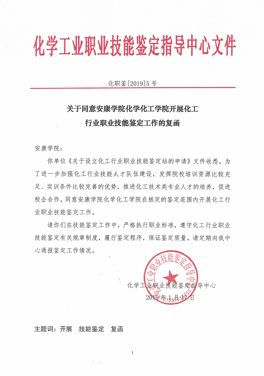 近日,国家化学工业职业技能鉴定指导中心正式下文,批准我校为化工行业职业技能鉴定实训基地,主要面向西北地区高等院校和化工行业企事业单位,由化学化工学院具体组织开展化工行业职业技能鉴定工作。按照国务院最新公布的国家职业资格目录清单内19个化工行业工种标准,我校成功获批化工总控工、有机合成工、工业固体废物处理处置工、工业废水处理工、化学检验员5个工种的初、中、高级职业技能等级鉴定工作。