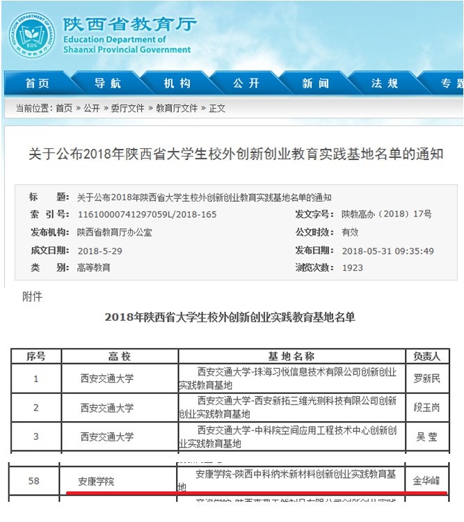 近日,陕西省教育厅公布了2018年陕西省大学生校外创新创业教育实践基地名单,我校化学化工学院申报的“Beat365正版唯一官网必一-陕西中科纳米新材料创新创业实践教育基地”获批建设立项。