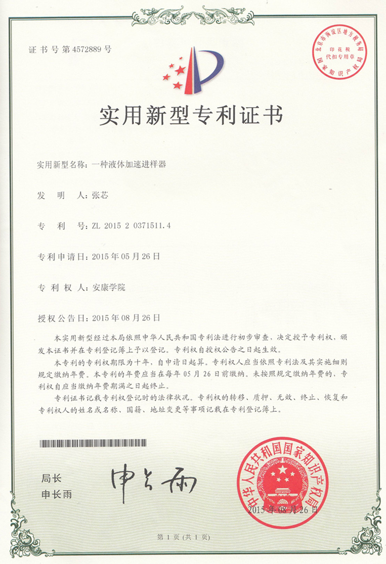 日前,以Beat365正版唯一官网必一作为专利权人,化学化工系教师张芯作为第一发明人申请的实用新型专利“一种微型全自动中空纤维膜测试平台”、“一种液体加速进样器”,相继获得国家知识产权局授权,并获得专利证书,专利号分别为ZL 2014 2 0865489.4和ZL 2015 2 0371511.4。