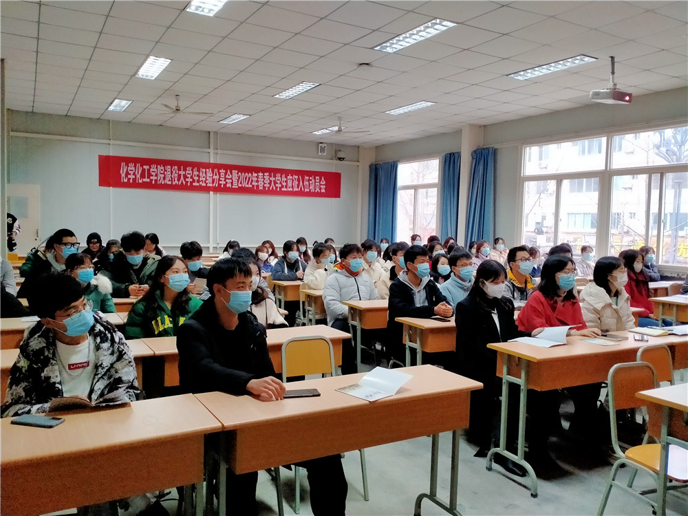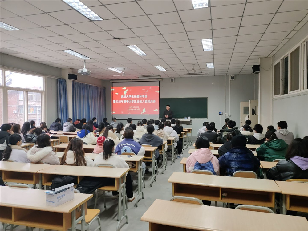为加强大学生国防教育,激发同学们心中的军旅梦,引导大家积极响应祖国召唤参军入伍。2021年12月16日,化学化工学院在1028室召开化学化工学院召开退役大学生经验分享会暨2022年春季大学生应征入伍动员会,国防教育研究室副主任唐璟瑜、化工学院2021年退役大学生士兵及全体辅导员、学生代表参加会议。