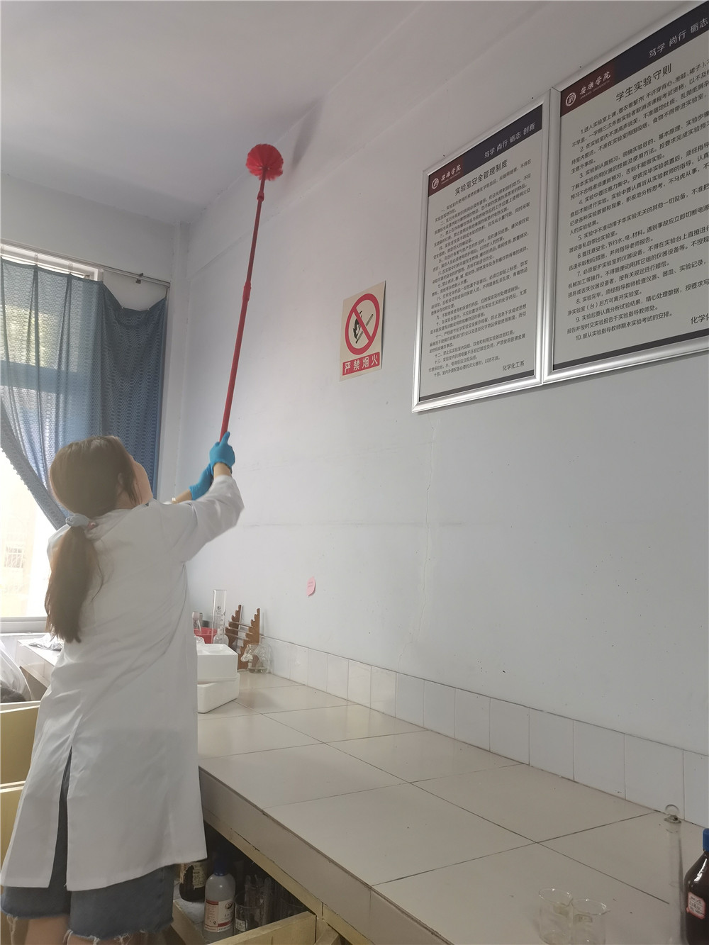 活动开展期间,2020级所有同学在各组组长的组织带领下,协助实验室管理老师对实验室进行打扫。在打扫的过程中,同学们热情饱满,积极主动地拿起清扫工具,仔细擦拭仪器、窗台,认真清扫地面灰尘,不放过任何一个落尘角落。