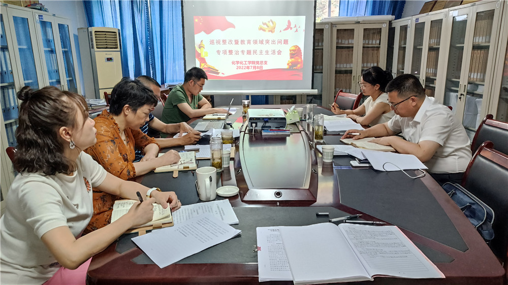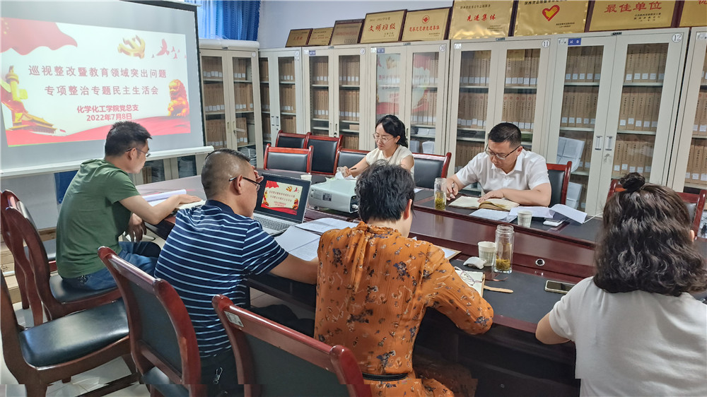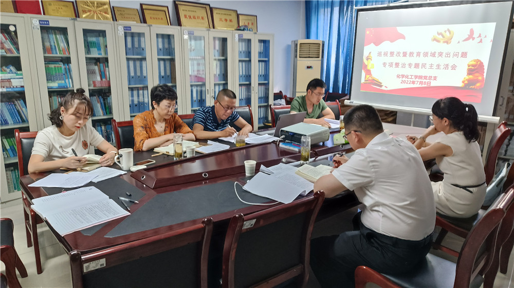 7月8日下午,化学化工学院领导班子“巡视整改暨教育领域突出问题专项整治”专题民主生活会在1325会议室召开,化学化工学院党总支书记王永东主持会议,学校联系领导余谦副校长、指导组成员马克思主义学院党总支书记田静参加会议。