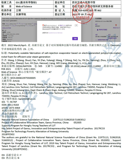 我校教师王硕以第一作者在工程技术领域国际TOP期刊《Desalination》(中科院大类一区TOP,IF: 11.211(2022))上发表的题为“Potentially scalable fabrication of salt-rejection evaporator based on electrogenerated polypyrrole-coated nickel foam for efficient solar steam generation”的研究论文被Essential Science Indicators(ESI)数据库遴选为对应领域同一出版年最优秀的前1%之列。