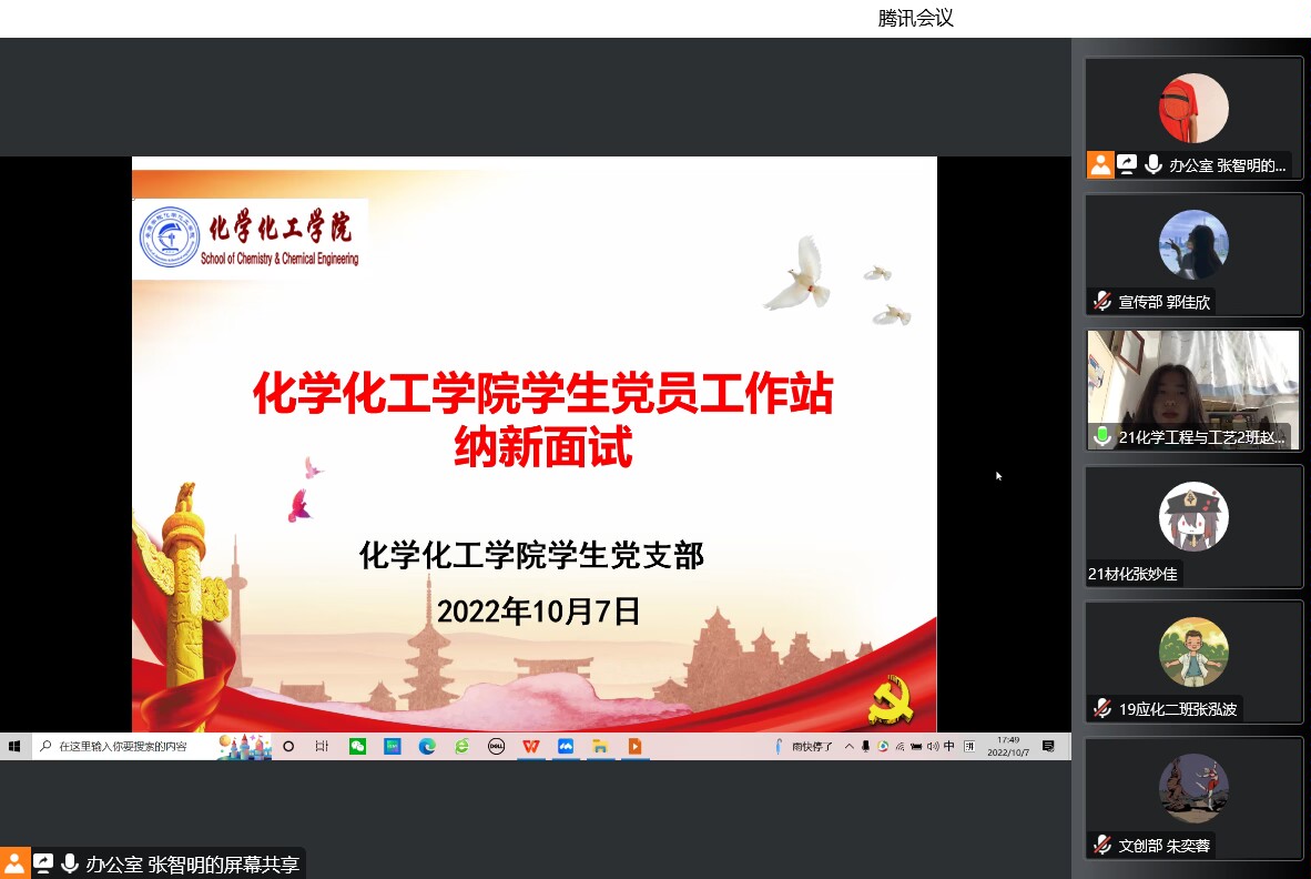 为了加强Beat365官网学生党员队伍建设,持续增强Beat365官网学生党支部的战斗力和凝聚力,保持和发展党组织的稳定性和先进性。Beat365官网学生党员工作站于2022年10月7日16:00进行线上纳新面试。学生党员工作站副站长及部门负责人共14人参加此次面试并担任面试官。