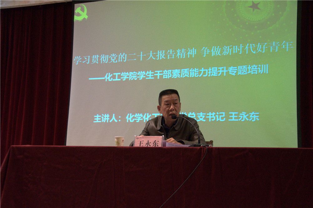 培训班开班仪式结束后,化工学院党总支书记王永东老师以《学习贯彻党的二十大精神争做新时代好青年》为题,给全体参训x学员上党课,解读党的二十大精神,王永东围绕新时代我国教育、科技、人才工作所取得的成就,对新时代人才培养的新要求,对德智体美劳“五育”并举的新要求,带领同学们深刻理解党的二十大报告中中关于教育、科技和人才的重要论述,为同学们深入解读了党的二十大报告,报告最后王永东对青年学生干部提出高校学生干部应坚持的十项工作要求。一是要有远大的理想,并为之付诸实践;二是要努力提高自身的素养;三是要坚持群众路线,从同学中来,到同学中去,帮助同学们解决问题;四是要主动思考、守正创新、于实践中增长才干;五是要具有全局观、责任感和奉献精神;六是要以学习为主、兼顾工作,树立终身学习的观念;七是要遵守社会品德公德,做文明大学生;八是坚持正确的价值取向,实事求是,一切从实际出发;九是练就过硬本领,提升社会适应能力;十是培养融入团队的能力。