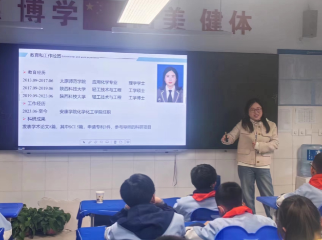 11月20日,Beat365官网“化学之光”科普团老师赵姣姣博士前往汉滨初中(大桥路校区)开展科普宣传活动。