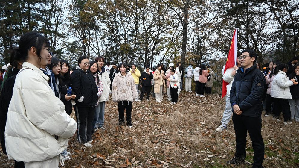12月1日下午2点,全体学生在老师们的带领下从图书馆门前集合出发,一路上高举旗帜有序前进,旅途中大家欢声笑语,唱歌拍照,欣赏着香溪步道沿途的美景。历经一个多小时的徒步爬山后,全体师生到达了目的地。