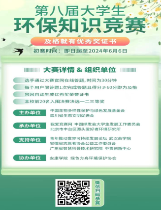 为积极响应“6·5”世界环境日号召,绿色方舟环境保护协会配合“中国生物多样性保护与绿色发展基金会”、“四川省生态文明促进会”举办第八届全国大学生环保知识竞赛,活动采用网络知识竞赛的方式普及环保知识,选手通过大赛官网在线答题,时间为30分钟,每个用户限答题1次完成答题且得分≥60分即为及格。该活动让更多同学关注环境变化,呼吁大家重视环境问题,与自然共生,与生态互助。