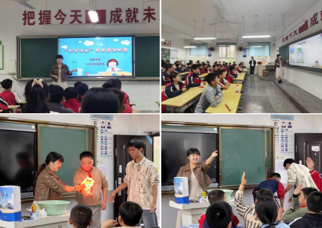 “实验魅力秀,科学趣味浓”,孟天姣老师从生活的衣、食、住、行四个方面引出化学的重要性并展开科普。由浅入深的讲解让同学们深刻认识到化学在我们的日常生活中无处不在。在科普团志愿者们的配合下,向同学们展示了“神奇的色彩”、“无中生有”和“掌中火”三个有趣的实验,过程中邀请同学们上台参与实验活动,在实践中让大家深刻感受到化学的魅力。