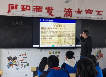 本次活动由闫超咸博士主讲。为同学们讲授了人体必需的六大营养成分:糖类、蛋白质、脂肪、水、无机盐、维生素;向学生们展示了多种零食和饮料的营养成分表,让学生们分组查看每种零食和饮料中的主要营养成分,现场计算一瓶饮料中的含糖量、判断巧克力制品中是否含有反式脂肪酸,分析了过量摄入糖和反式脂肪酸对人体健康的危害;接下来,闫老师讲授了判断牛奶、酸奶与含乳饮料的标准,教会学生选择蛋白质含量更高的乳制品;最后,闫老师通过海军军医大学在校生原创歌曲《唯爱生愫》,不仅讲解了各种维生素的作用及其在食物中的分布,而且开阔了学生的眼界,激发了学生为梦想努力学习的动力。