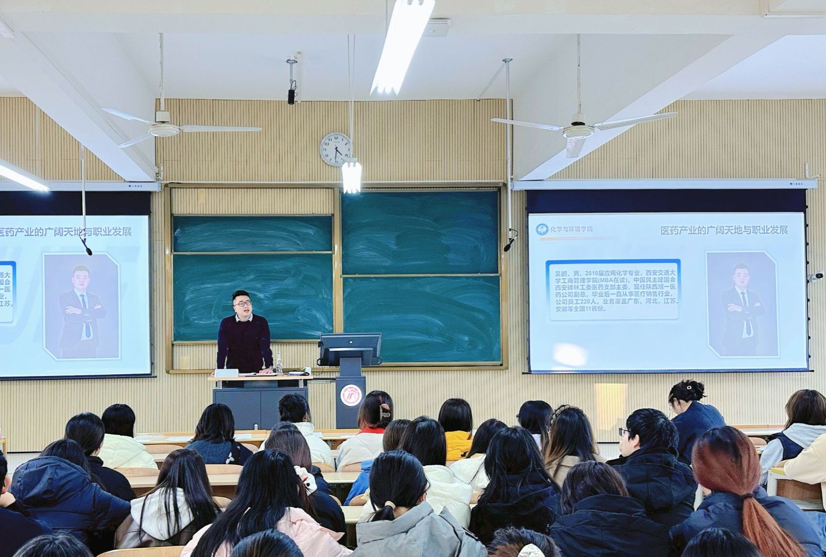 在专题分享环节,2014届应用化学专业校友、现为陕西旭一医药科技有限公司副总经理吴鹏走进1305教室,以“医药产业的广阔天地与职业发展”为主题,与制药工程、化学工程与工艺专业学生展开了深入交流。他结合自身从基层销售起步,逐步成长为管理全国11个省份业务的职业经历,系统讲述了医药产业的行业结构、发展趋势与人才需求,并围绕“医药行业不同岗位的发展路径”等话题,与现场同学进行了亲切问答。