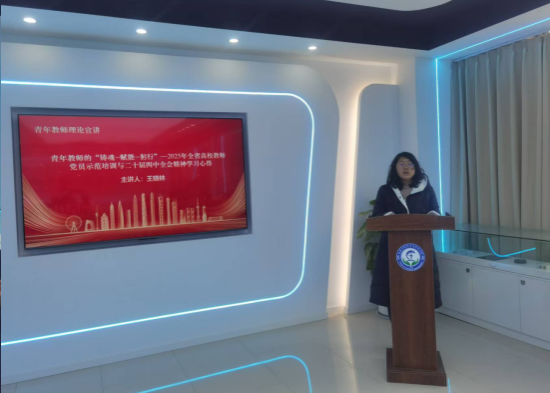 在理论宣讲环节,王晓林同志结合自身参加2025年全省高校教师党员示范培训的所学所悟,以鲜活案例、通俗语言解读全会精神。宣讲紧扣“铸魂-赋能-躬行”主题:“铸魂”环节聚焦立德树人根本任务,阐释如何将党的创新理论融入课堂教学全过程,筑牢师生理想信念之基;“赋能”板块围绕学科建设、科研创新展开,分享对接国家战略需求、深化产教融合的实践径;“躬行”部分倡导教师党员立足岗位实际,把学习成果转化为教书育人、科研攻关的具体行动。